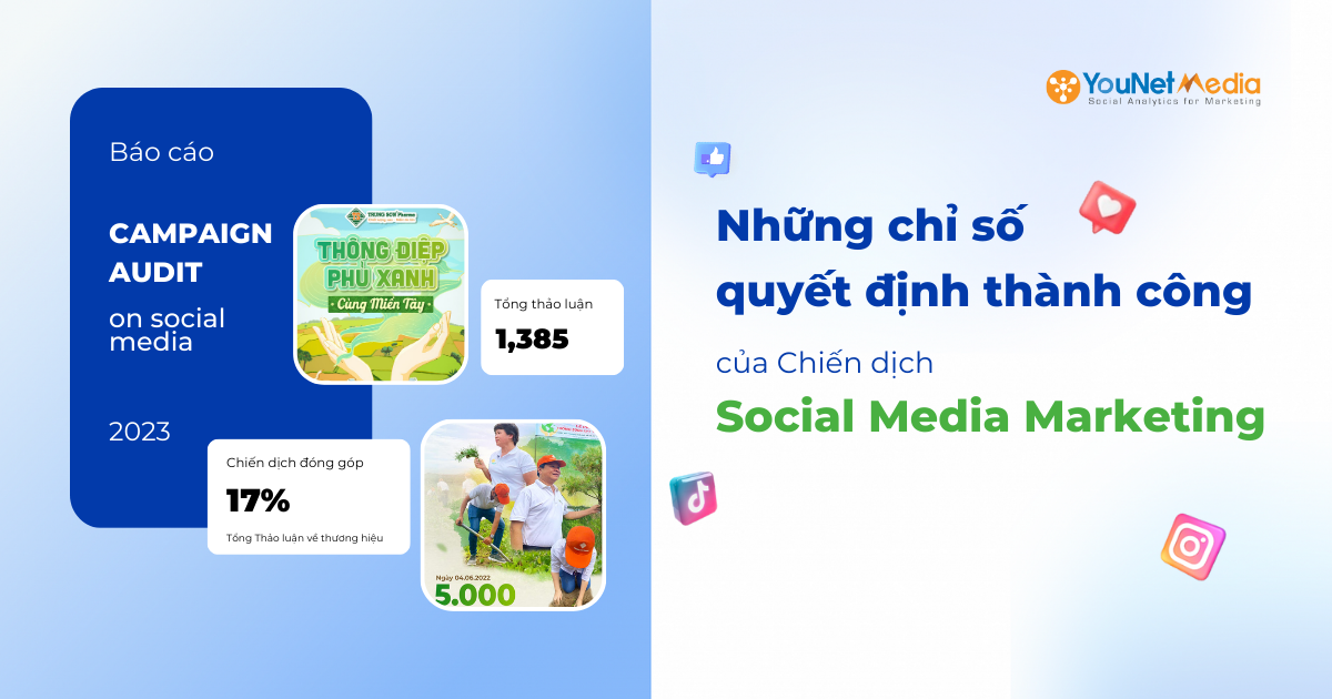 Cùng YouNet Media thực hiện báo cáo Campaign Audit  on Social Media – báo cáo giúp cung cấp góc nhìn khách quan, toàn diện từ dữ liệu Social Listening về ảnh hưởng của chiến dịch (đã triển khai) đến độ nhận diện thương hiệu trên MXH, phản hồi của người dùng về chiến dịch & quan sát tương quan các hoạt động truyền thông của đối thủ trong cùng thời điểm. Từ đây, đội ngũ quản lý thương hiệu có thể đánh giá khách quan dựa trên số liệu và đưa ra những quyết định tối ưu cho chiến dịch tiếp theo thành công và bùng nổ hơn trên MXH.