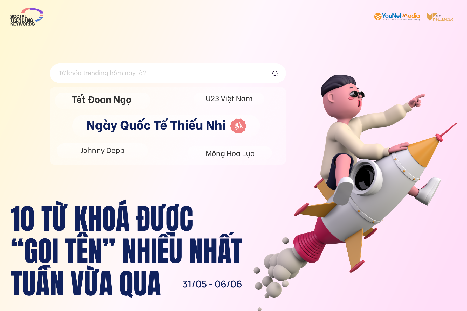Từ tháng 11/2021, The Influencer Vietnam hợp tác cùng YouNet Media, đơn vị tiên phong và dẫn đầu trong lĩnh vực phân tích dữ liệu mạng xã hội (social analytics) tại Việt Nam, để công bố danh sách từ khóa thịnh hành trên mạng xã hội, mang tên Social Trending Keywords.Danh sách sẽ được cập nhật chính thức trên website của The Influencer vào 9h sáng mỗi thứ 3 hàng tuần, cùng với các bài phân tích chuyên sâu về các từ khóa nổi bật nhất.