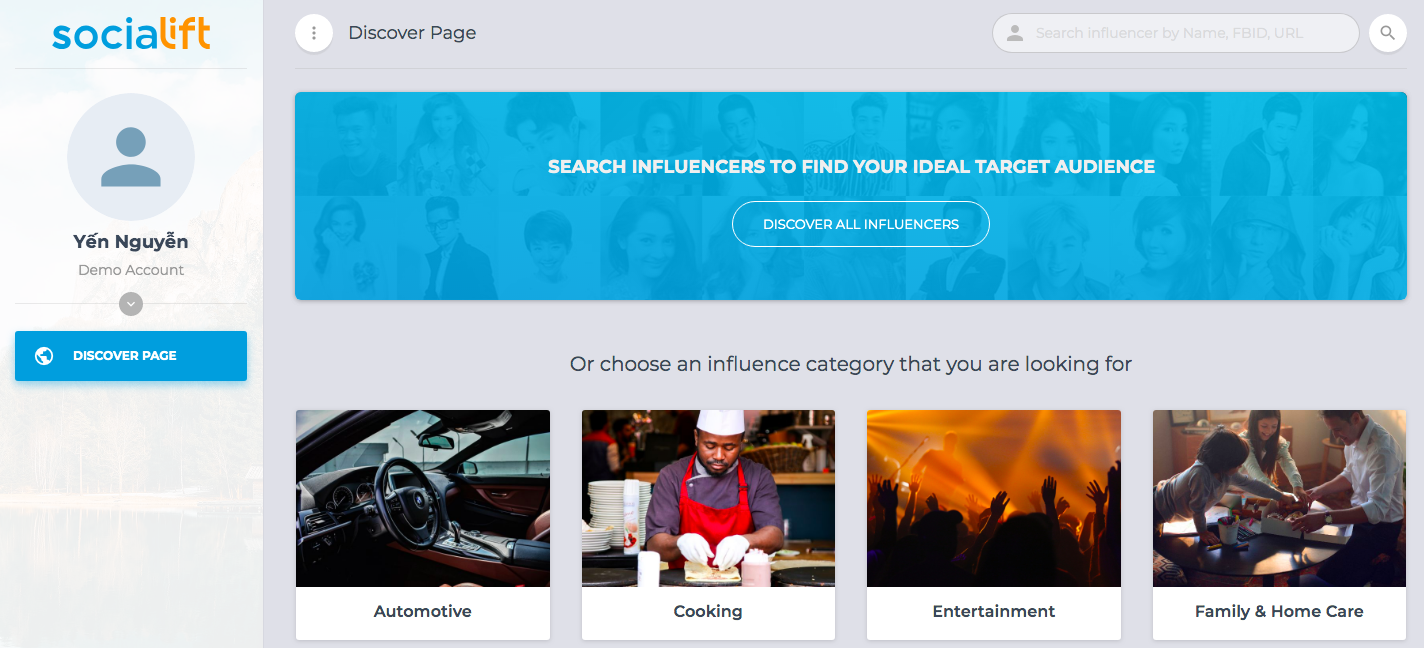 Hiện tại, SOCIALIFT sở hữu 10.000+ Influencer profile bao gồm cả Facebook Cá nhân, Facebook fanpage và Kênh Youtube. Tuy nhiên, tài khoản Demo chỉ có thể trải nghiệm và xem các profile của Facebook cá nhân.